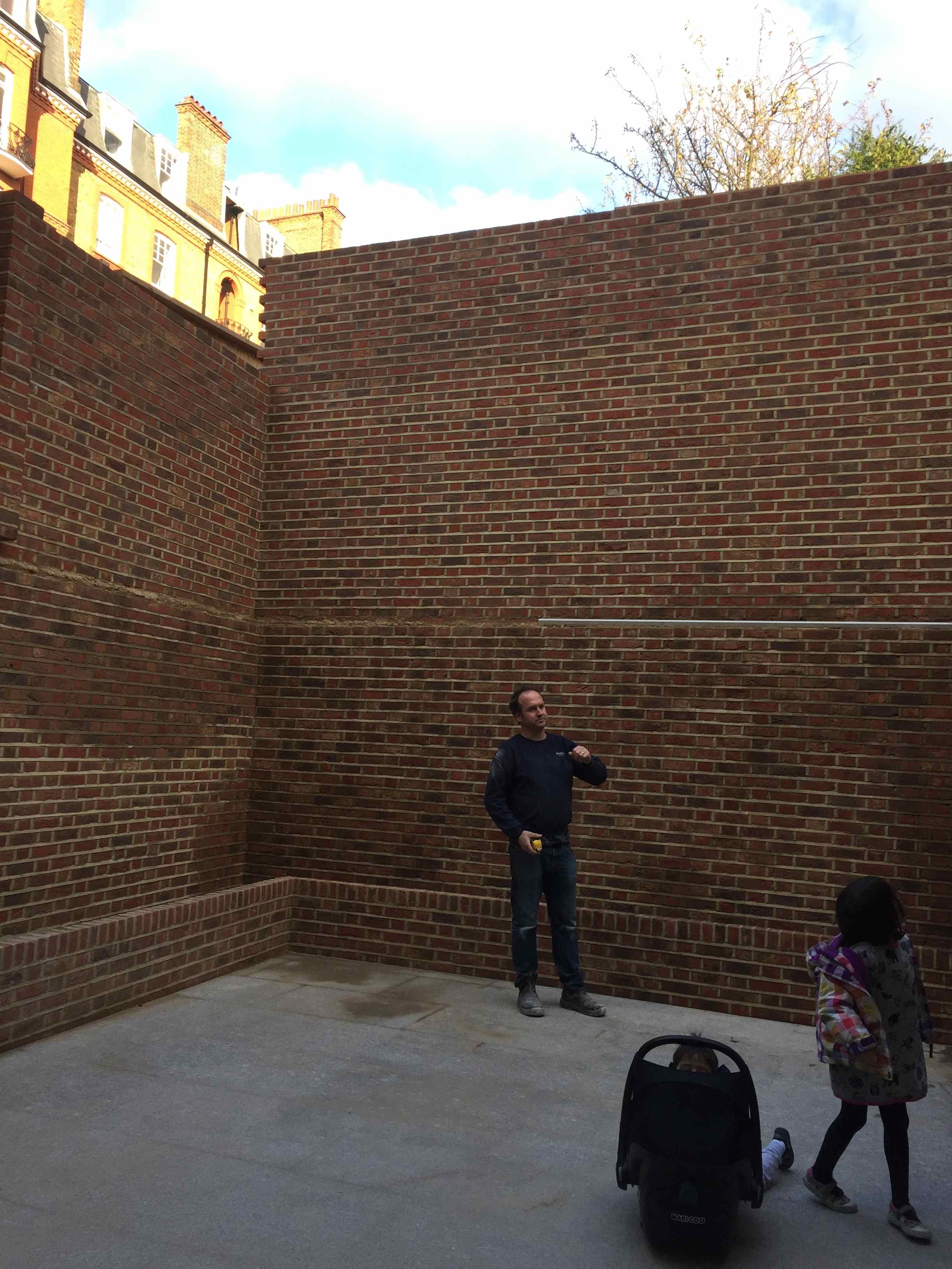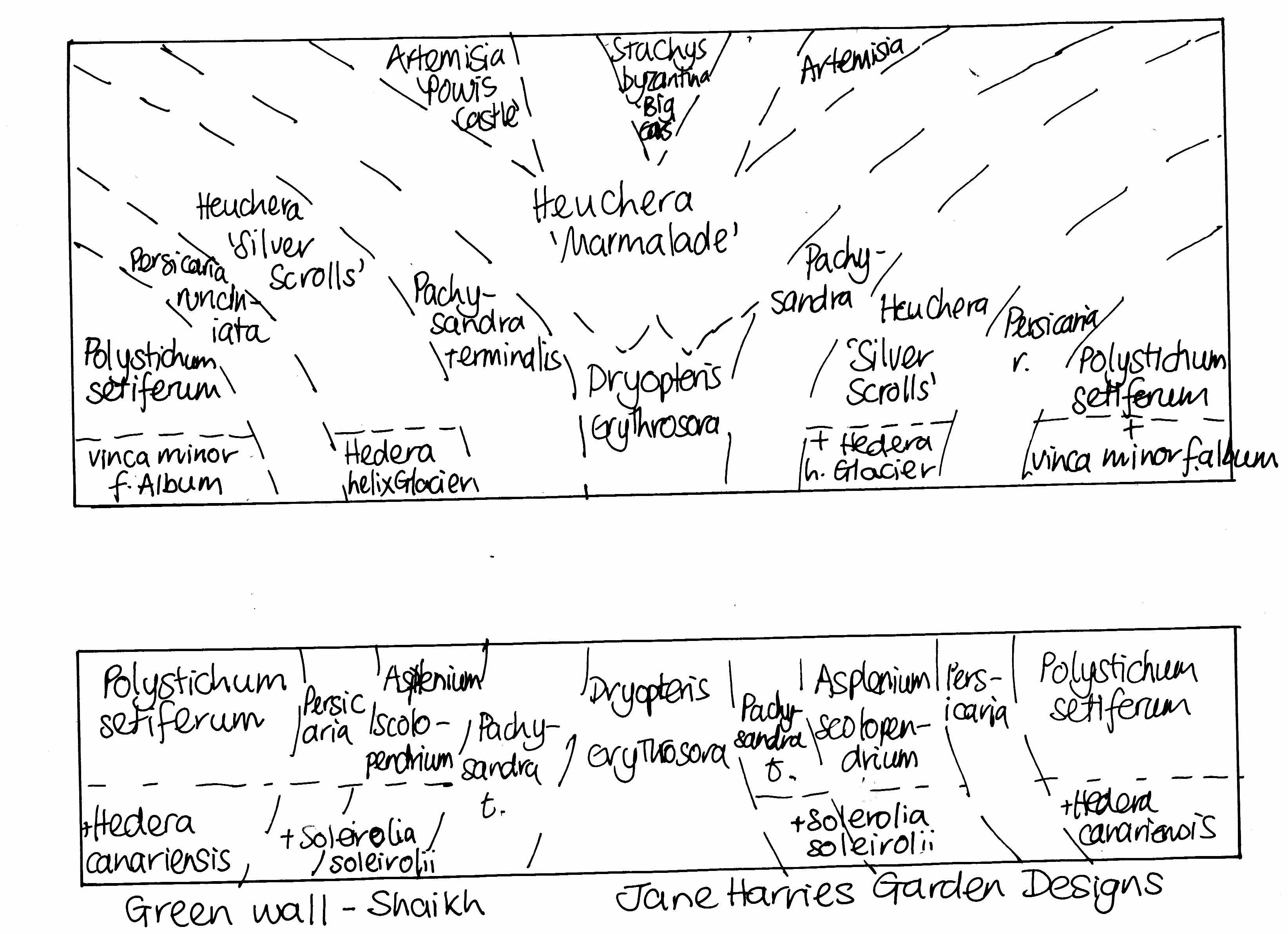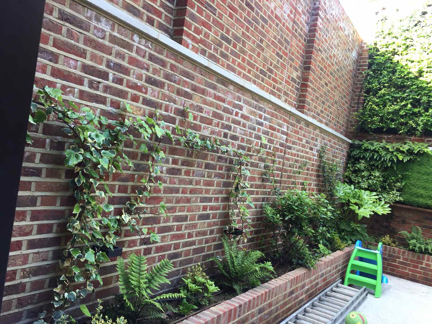 My clients had 3 high, blank walls and wanted them to be covered in lush verdant evergreen planting. They both have hay fever, so plant choice is important. A green wall was included on one wall, with climbers on the others, and shade-loving planting like ferns and fatsia in the raised beds round the base.