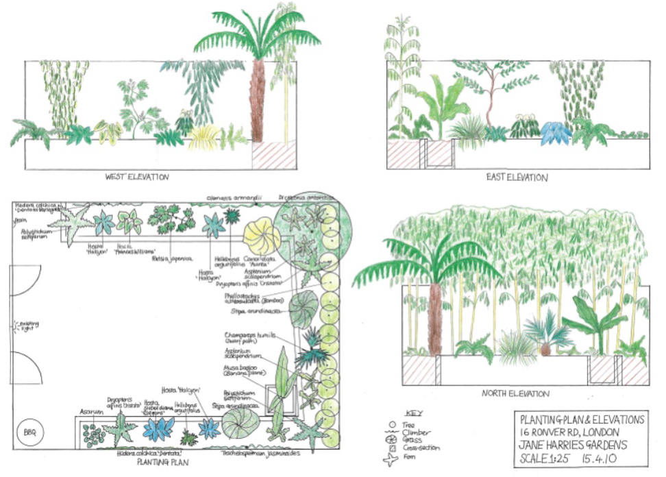 This project was to produce a planting plan for 3 raised beds in a small city garden. The clients wanted to screen out views of neighbouring houses above all and to have lush, dense, greenery. I included a tree fern and a banana as well as a dwarf palm and lots of bamboo for the screening. For winter interest there are fatsia, ferns, carex (yellow pond sedge) and hellebores as well as evergreen climbers.