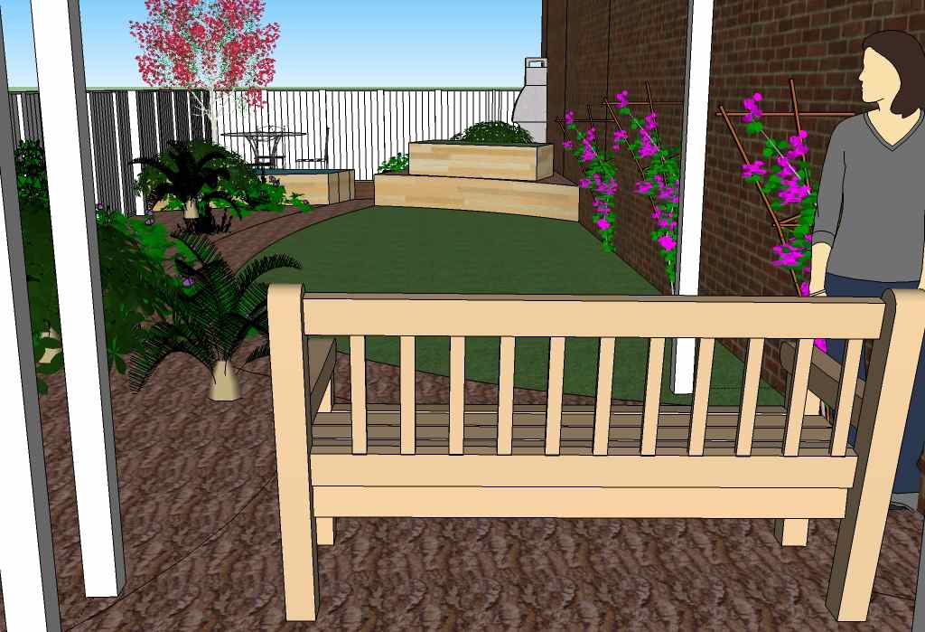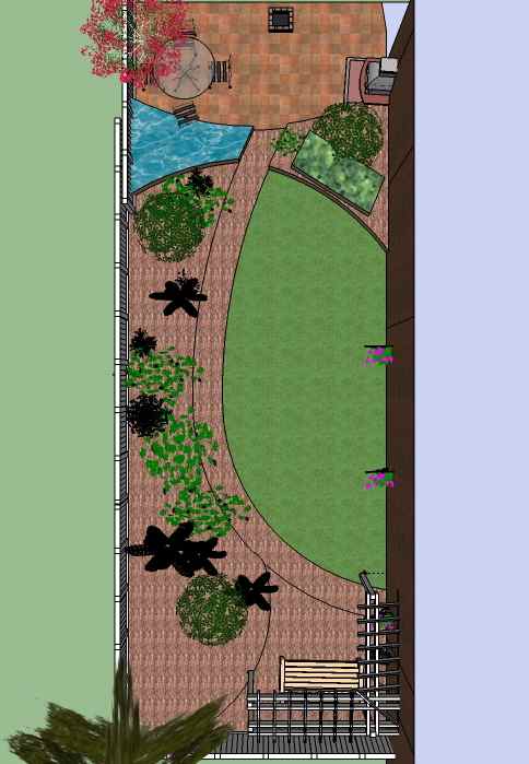 My client had just moved in to a flat above a garage on an estate, with a long narrow garden heavily overlooked by other houses. It was a blank slate, and he wanted a space with the ‘wow’ factor, somewhere to relax after work and to grow plants in. He loves mowing the lawn, too!