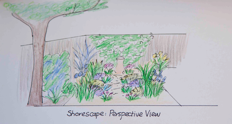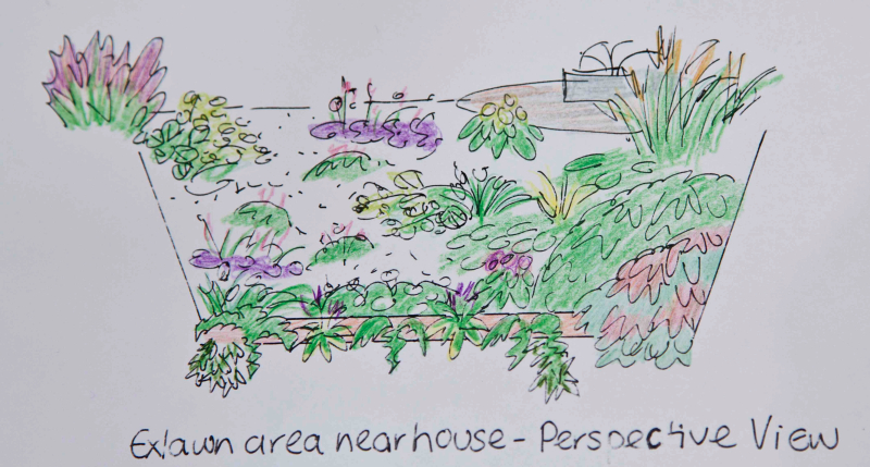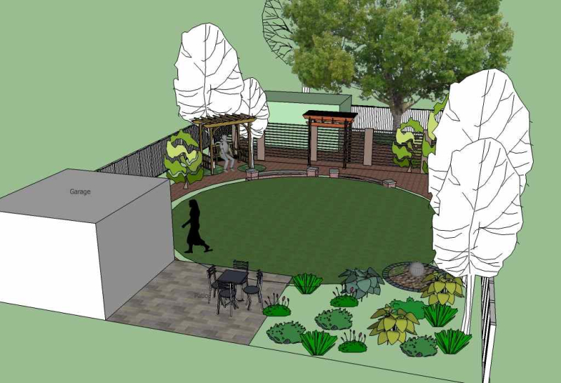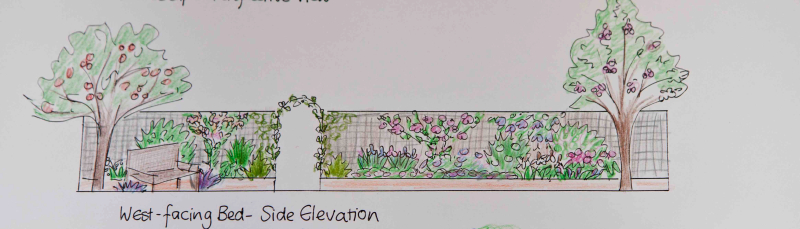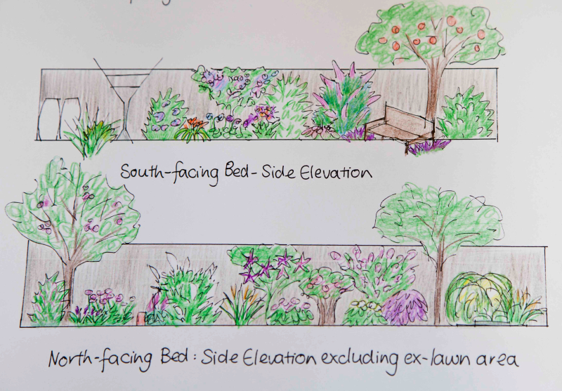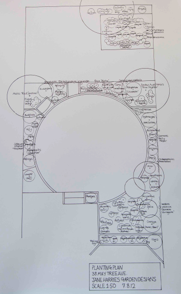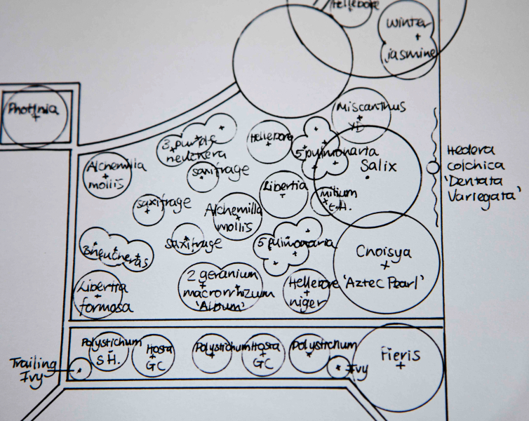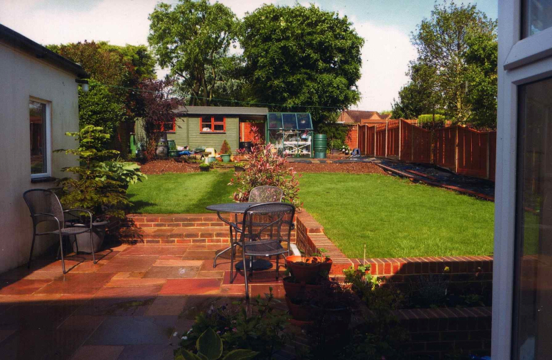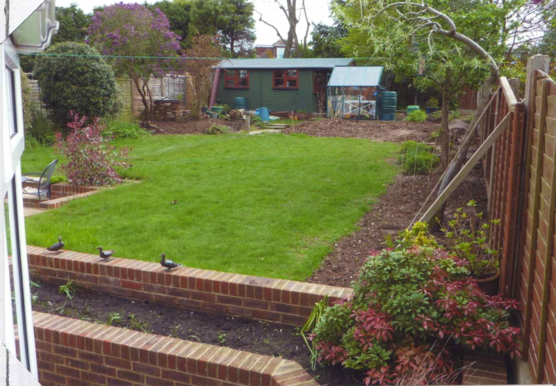 A recently-retired couple wanted to make their garden more attractive, with a mixture of low-maintenance mixed planting and some areas of specialist planting. They wanted to separate out different areas of the garden and have more seating within it. The new design had to fit in with a recently-built patio and a gradual slope upwards from the house. The resulting design gives more to see from the house and patio, while providing separate areas for growing vegetables and relaxing, for a new phase in the owners’ lives.
